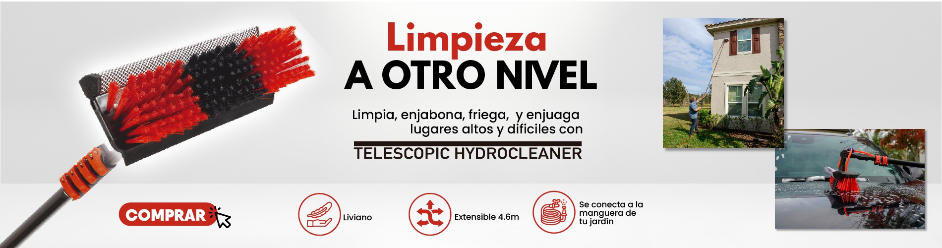Telescopic Cleaner es la escoba telescópica de lavado con mango extensible, todo en uno. Limpia en profundidad esos lugares altos y difíciles de forma rápida y segura: su mango extensible alcanza hasta 4.6 metros.